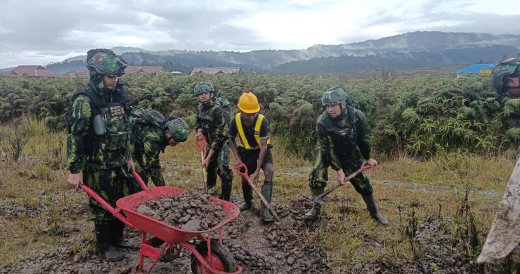 Agandugume, Papua - Di tengah udara dingin pegunungan dan hamparan awan yang seakan menyentuh bumi, semangat gotong royong antara prajurit TNI dan masyarakat kembali bergelora. Prajurit Satgas Yonif 142/KJ Pos TK Agandugume bersama warga setempat bahu membahu memperbaiki landasan Bandara Agandugume, fasilitas vital yang menjadi urat nadi transportasi dan kehidupan masyarakat di wilayah terpencil Papua. Sabtu (18/10/2025).